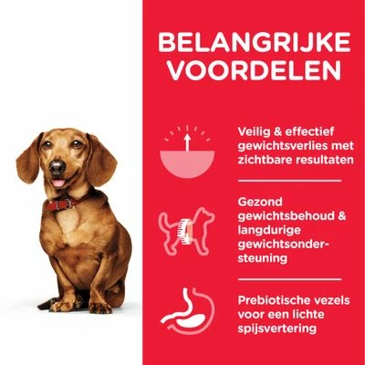 Vaak worden de negatieve gevolgen bij honden van overgewicht onderschat. Honden die te zwaar zijn kunnen te kampen krijgen met een verlaagde levensverwachting en vitaliteit. Hill’s Science PlanAdult Perfect Gewicht Mini kan jouw hond op een natuurlijke manier met dit probleem helpen: Dankzij de klinisch bewezen formule kan je hond worden geholpen om zijn ideale gewicht te behalen en vast te houden. Hierdoor worden problemen met de gezondheid van je hond, zoals pancreatitis, huidziekten, mellitus of atritis en verminderde beweeglijkheid voorkomen.