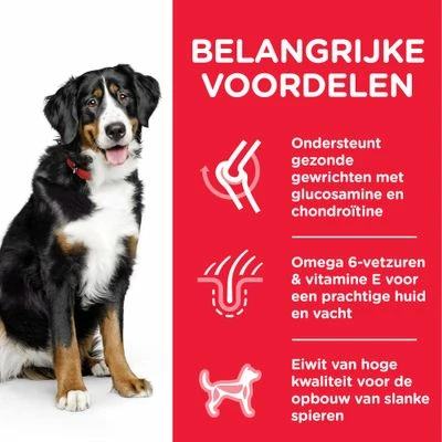 Het hondenvoer van Hill’s Science Plan is gemaakt met kip en biedt jouw hond veel hoogwaardige eiwitten, die kunnen helpen spiermassa te behouden. Bovendien kan het droogvoer met ingrediΓ«nten zoals glucosamine en chondroΓ―tine de gezondheid van de gewrichten ondersteunen, wat een belangrijk probleem is, vooral voor grote rassen. Het bevat ook waardevolle omega-6-vetzuren en vitamine E, die een gezonde huid en glanzende vacht kunnen bevorderen. The Hill’s Science Plan Adult Large BreedΒ hondenvoer met kip vereist geen kunstmatige toevoegingen zoals kleuren, smaken en conserveermiddelen.